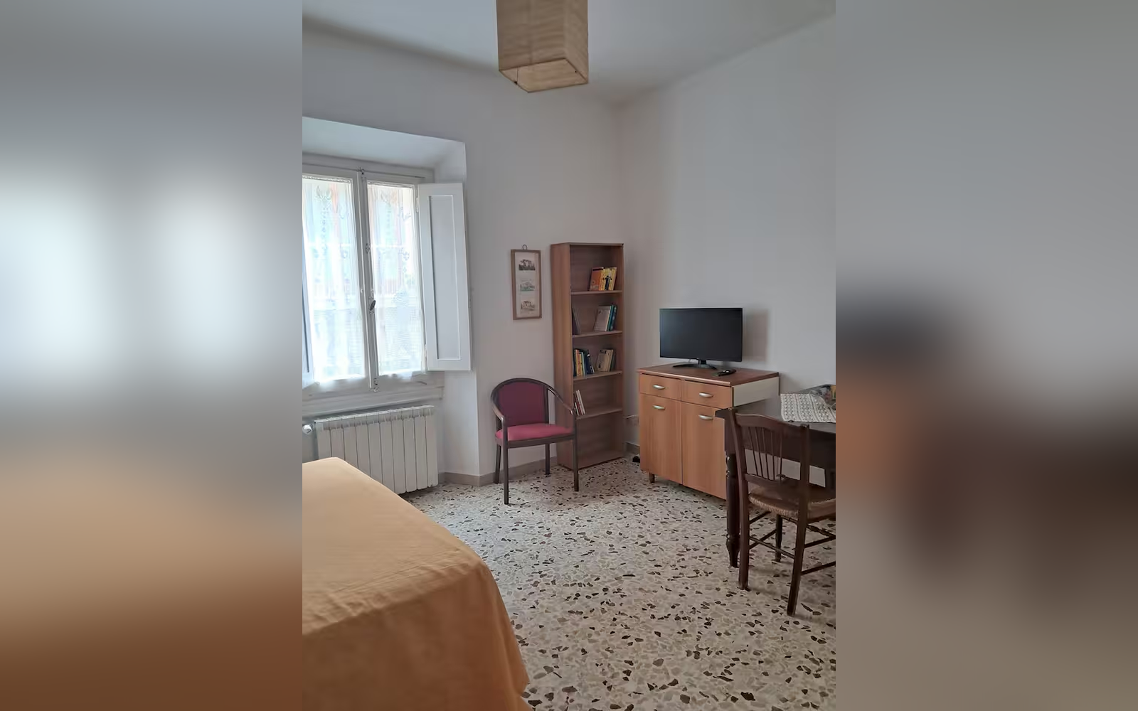 Monolocale di 28 mq situato al primo piano con accesso indipendente. L'alloggio è composto da un unico ambiente con letto matrimoniale, armadio, tavolo, TV e angolo cottura ben attrezzato. Attraverso un piccolo corridoio si raggiunge il bagno con ampia doccia e finestra su corte interna. Le mura storiche mantengono naturalmente fresco l'ambiente anche in estate, offrendo comfort e tranquillità in ogni stagione.